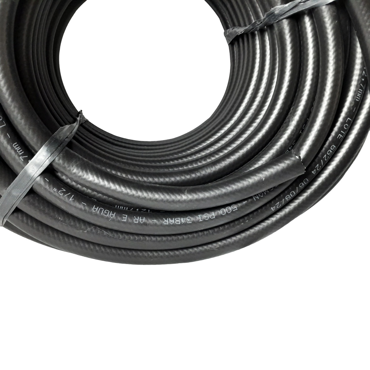 Mangueira pneumática de 1/2”, reforçada, indicada para uso com ar comprimido em compressores, ferramentas pneumáticas e linhas industriais. Construção em borracha sintética com reforço têxtil, oferecendo alta durabilidade, boa flexibilidade e desempenho seguro em operações de média/alta exigência. Suporta 500 PSI, ideal para oficinas, indústrias e frotas próprias.